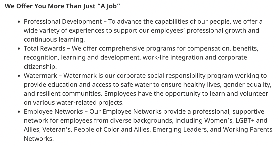This inclusive job listing from water technology provider Xylem lists the perks of the job, including access to employee networks that provide internal support for diversity and inclusion.